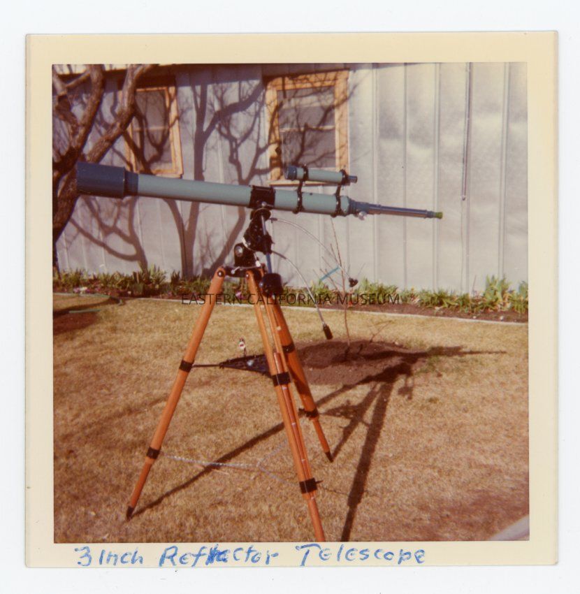 Color print of a telescope set up in somebody's yard. Written in blue ink below photo is: 3 inch refractor telescope. This is likely one of the telescopes owned or used by the Eastern California Museum for night sky programs.Collection
