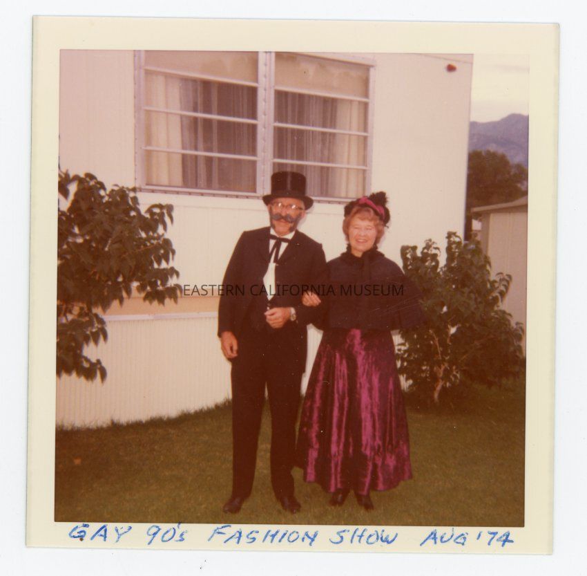 Color photo of Leonard and Lena Sluyter dressed in costumes. Written in blue ink below the photo is: Gay 90s [1890s] Fashion Show, Aug. '74.Collection