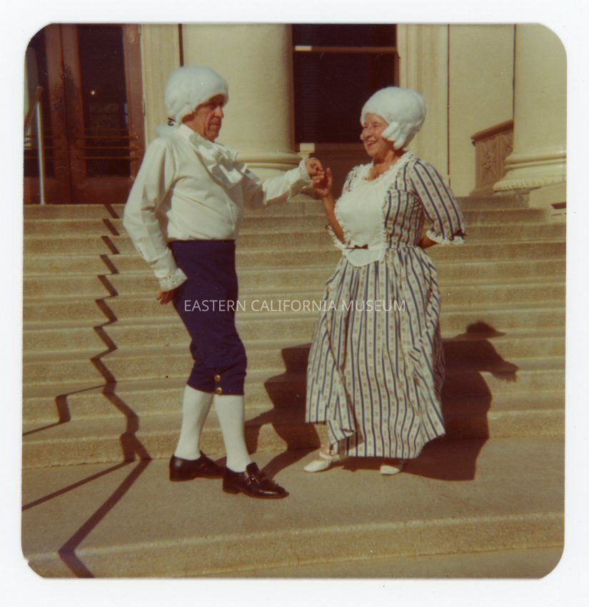 Color photo of Leonard and Lena Sluyter dressed in American Colonial costumes and dancing on the steps to the Inyo County Courthouse.