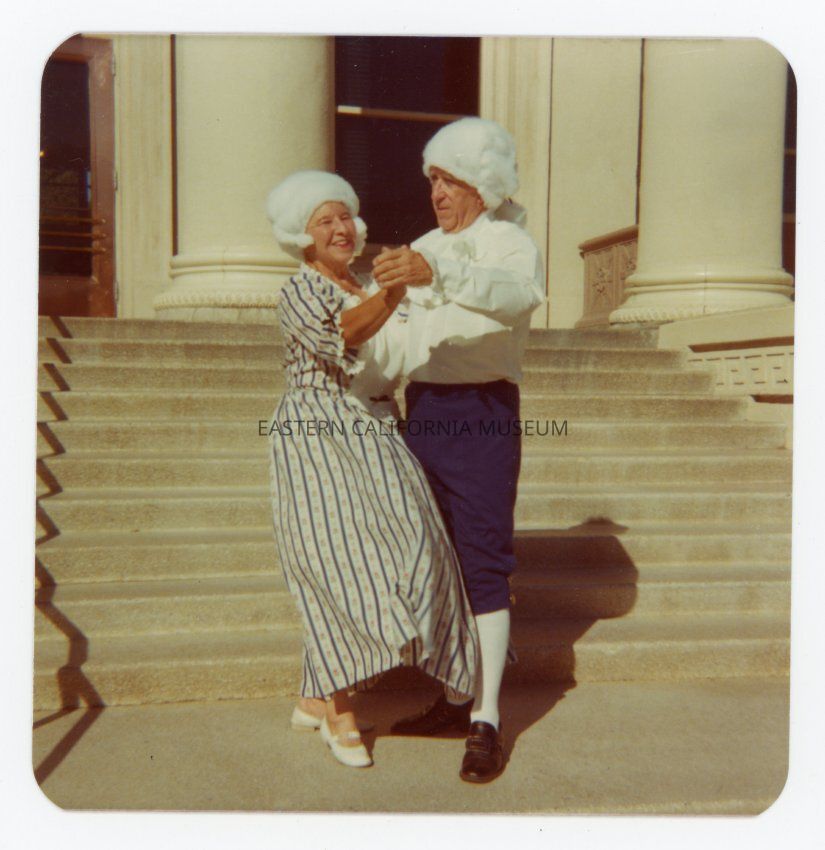 Color photo of Leonard and Lena Sluyter dressed in American Colonial costumes and dancing on the steps to the Inyo County Courthouse.