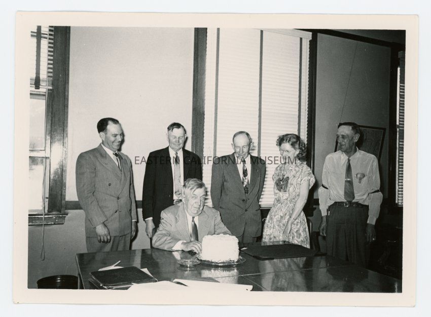 Photo of a group of six people (five standing, one sitting) celebrating a birthday with a cake. Appears to have been taken inside the Inyo County Courthouse.