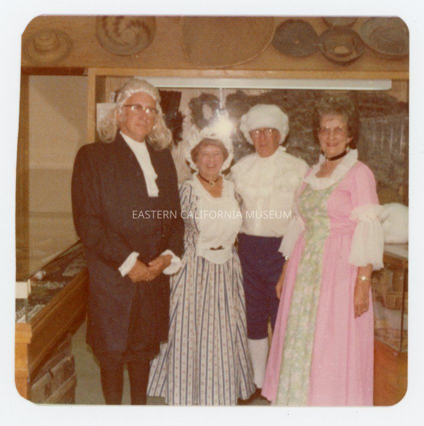 Color photo of Leonard and Lena Sluyter along with another couple dressed in American Colonial costumes standing inside the Eastern California Museum's basket exhibit.