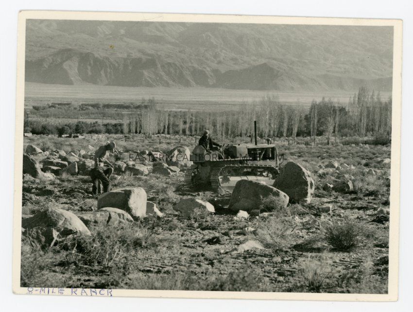 Photo of three men using what appears to be a bulldozer in a rocky field. Written below the photo is, "8-Mile Ranch."