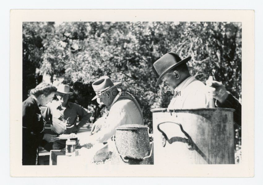 Photo of two men searving food outdoors at a picnic. There is a woman receiving her plate of food on the left side and two large pots in the foreground.