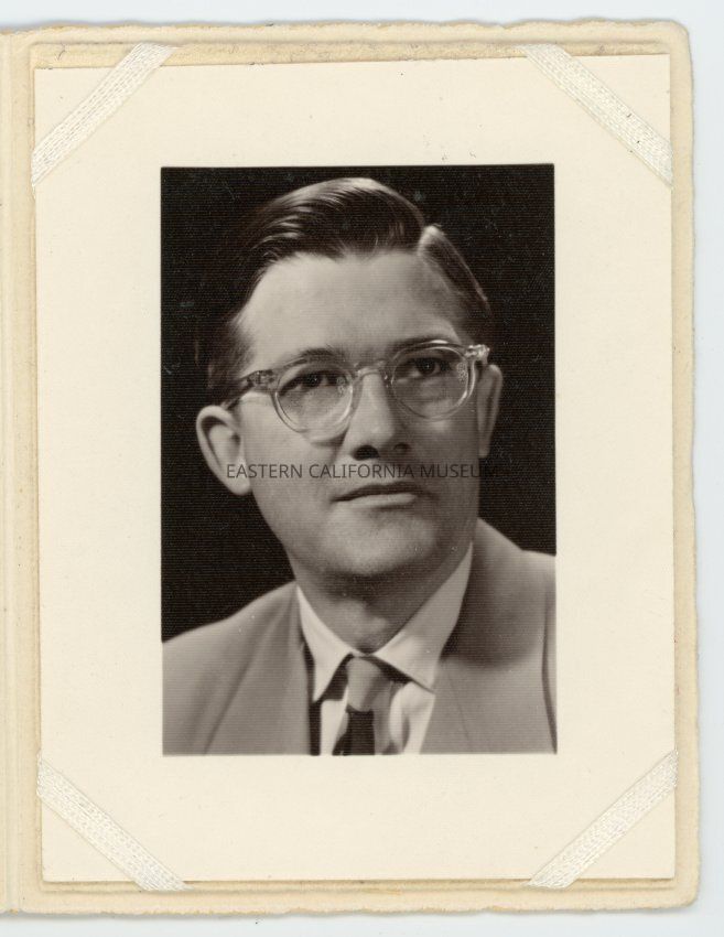 Bust-length studio portrait of Judge Hugh Brierly. He was an Inyo County Judge from 1950-1951. This photo is enclosed in a protective folding card from photographer Curtis Phillips of Bishop, CA.Collection