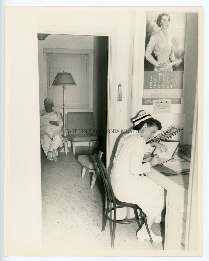 Photo of the interior of the Mt. Whitney Hospital in Lone Pine showing a nurse writing at a desk and a patient sitting in the room beyond.Collection