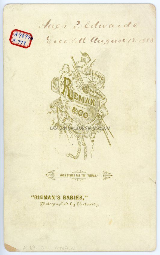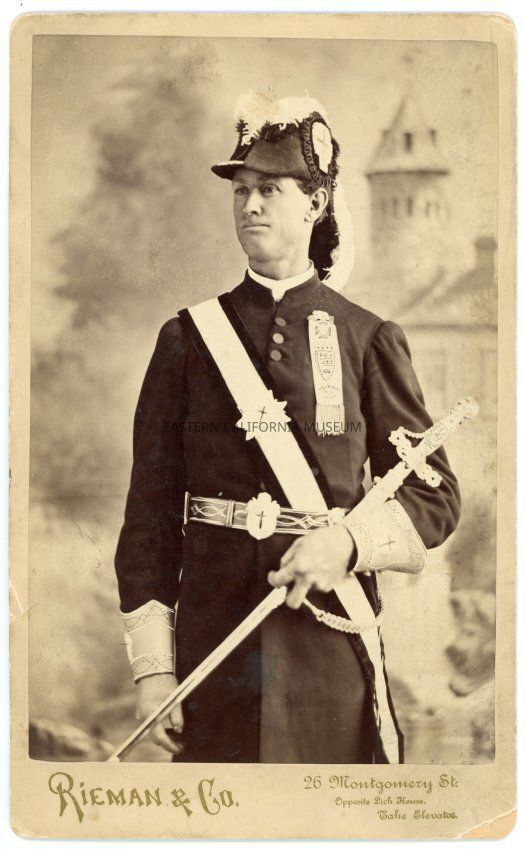 Photograph affixed to card of Hugh P. Edwards, oldest son of Thomas Edwards, wearing an elaborate uniform, feathered hat, sash, and holding a sword. Possibly a Masonic Lodge ceremonial uniform? Photo by Rieman and Co. of San Francisco. The word "Crockett" is handwritten in black ink on reverse--perhaps where Hugh was born or where the photo was taken.Made/Created