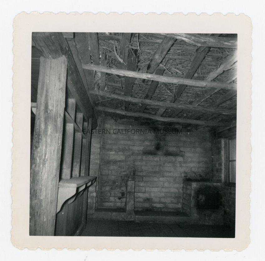 Photo of the empty interior of a building. Possibly a set for the TV show Rawhide in the Alabama Hills?