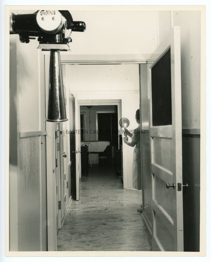 Photo of the interior of the Mt. Whitney Hospital in Lone Pine showing a woman holding an unidentified light source.Collection