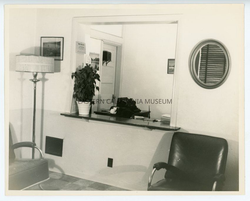 Photo of what is likely the reception desk of the Southern Inyo Medical Group, consisting of Dr. George D. Shultz and Dr. William. E Gullett, or the Mt. Whitney Hospital in Lone Pine.Collection