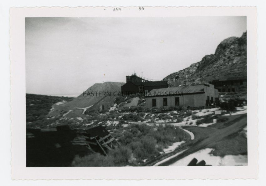 Photo of Cerro Gordo, possibly the mill, taken or printed in January 1959. There are patches of snow on the ground and a large tailings pile in the background.Collection