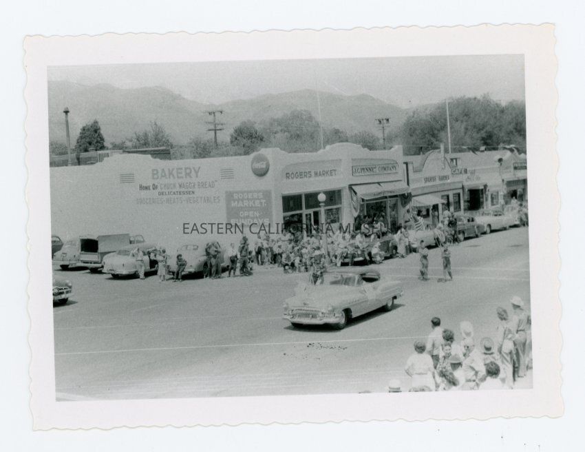 Photo taken from a high vantage point (on top of a building) of a parade going down Main Street in Lone Pine. This photo shows a vehicle and two people holding flags walking behind it. The Rogers Market, J. C. Penney Company, and Spanish Garden Cafe are visible across the street.Collection