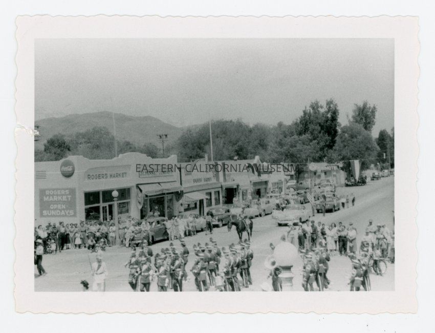 Photo taken from a high vantage point (on top of a building) of a parade going down Main Street in Lone Pine. This photo shows a marching band. Roger's Market, J. C. Penney Company, Spanish Garden Cafe, and a motel are visible on the other side of the street.Collection