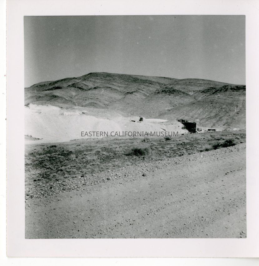 B&W. Shot of the desert, piles of dirt (tailings?), a shack or old building.