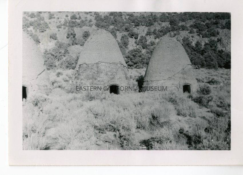 B&W. Three charcoal kilns in Little Fish Lake Valley.
