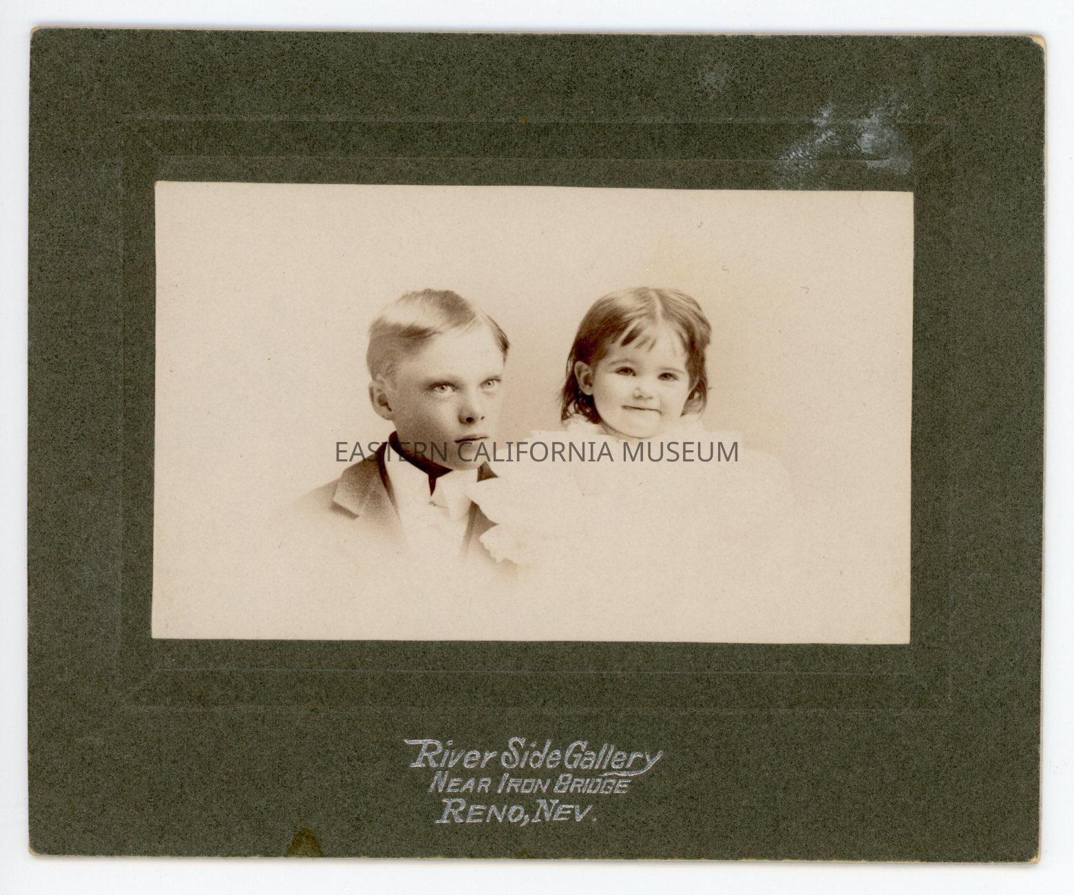 Mounted studio portrait of a young boy and baby girl. Photographer was River Side Gallery (near Iron Bridge) in Reno, NV. They are identified on the back as Frank and Genevieve Kilpatrick.