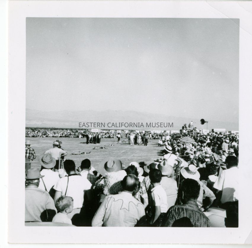 B&W. Large gathering of people around a dirt arena.
