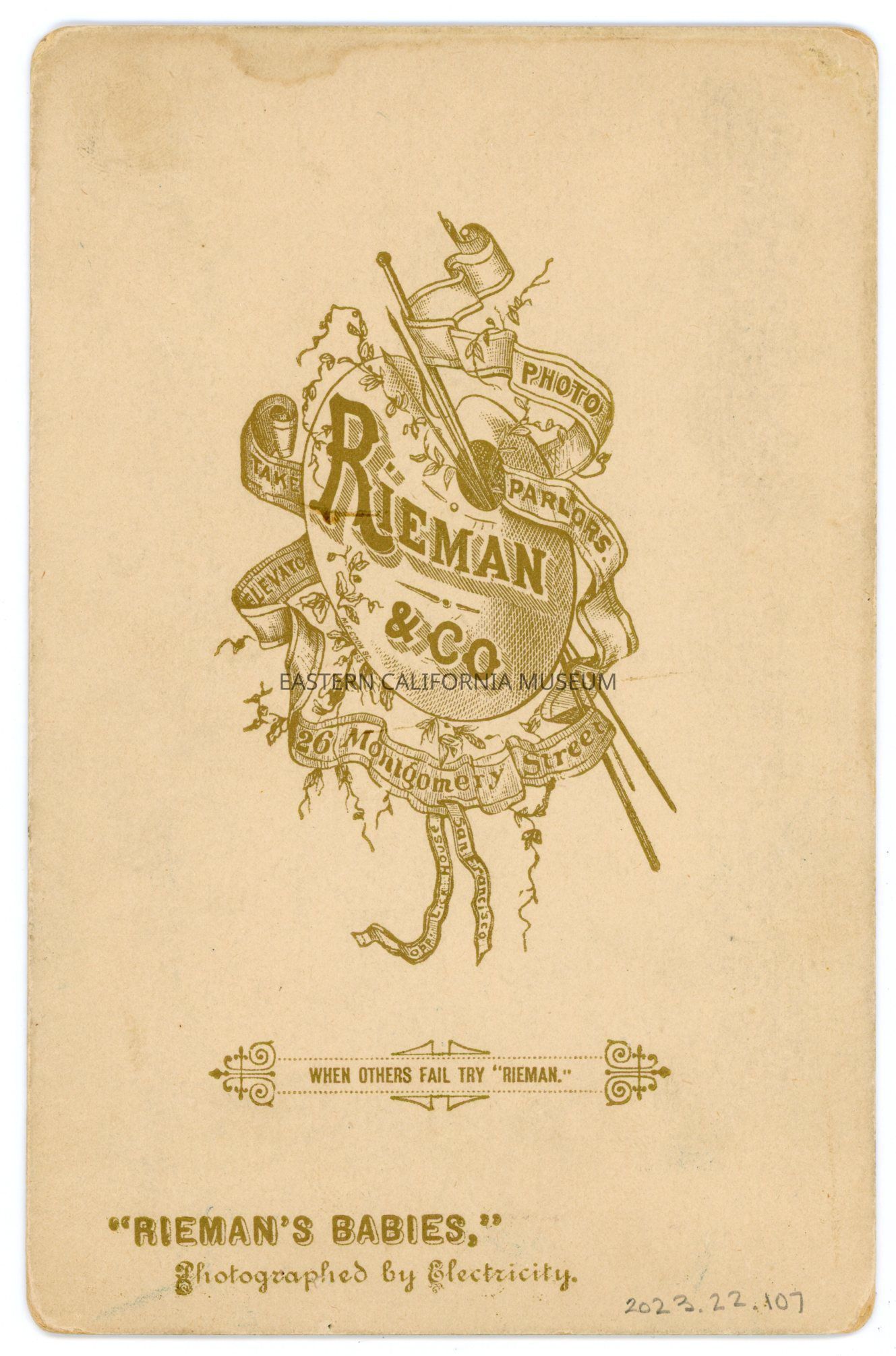 Mounted studio portrait of a man identified as Alex Kilpatrick wearing an elaborate uniform, feathered hat, sash, and holding a sword. Possibly a Masonic Lodge ceremonial uniform? Photographer was Rieman and Co. of San Francisco.