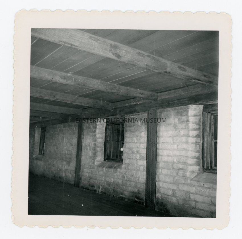 Photo of the empty interior of a building. Possibly a set for the TV show Rawhide in the Alabama Hills?
