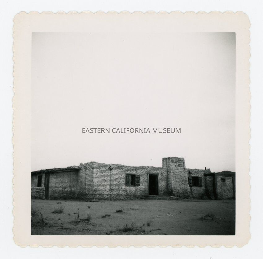 Photo of the exterior of a brick or adobe building with a sign saying "Rawhide Station." Possibly a set for the TV show Rawhide in the Alabama Hills?Collection