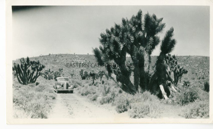B&W. Vehicle on a dirt road in desert. Joshua trees (or yucca trees?).