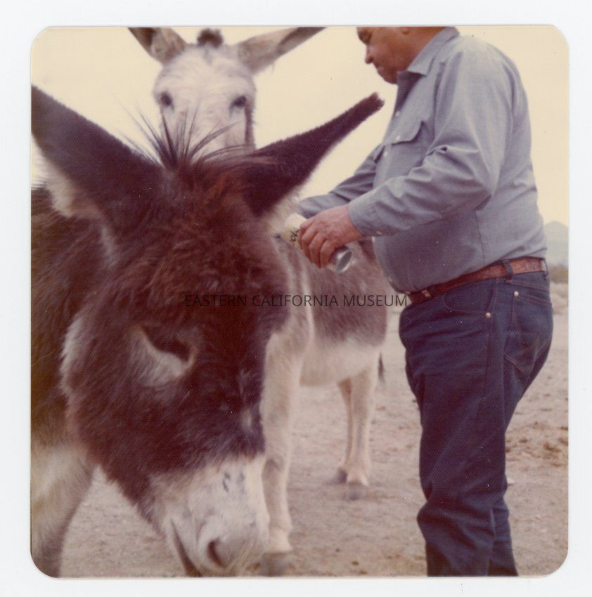 Color photo of a man with two burros, possibly in Saline Valley.
