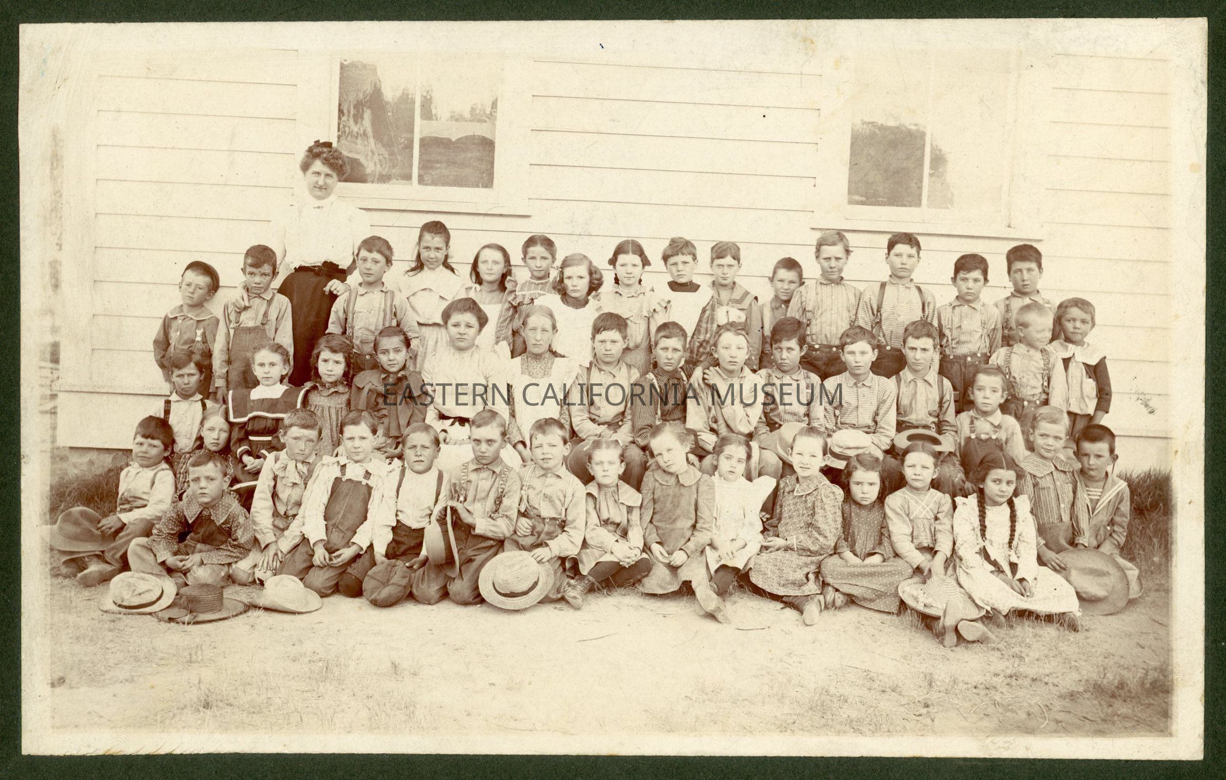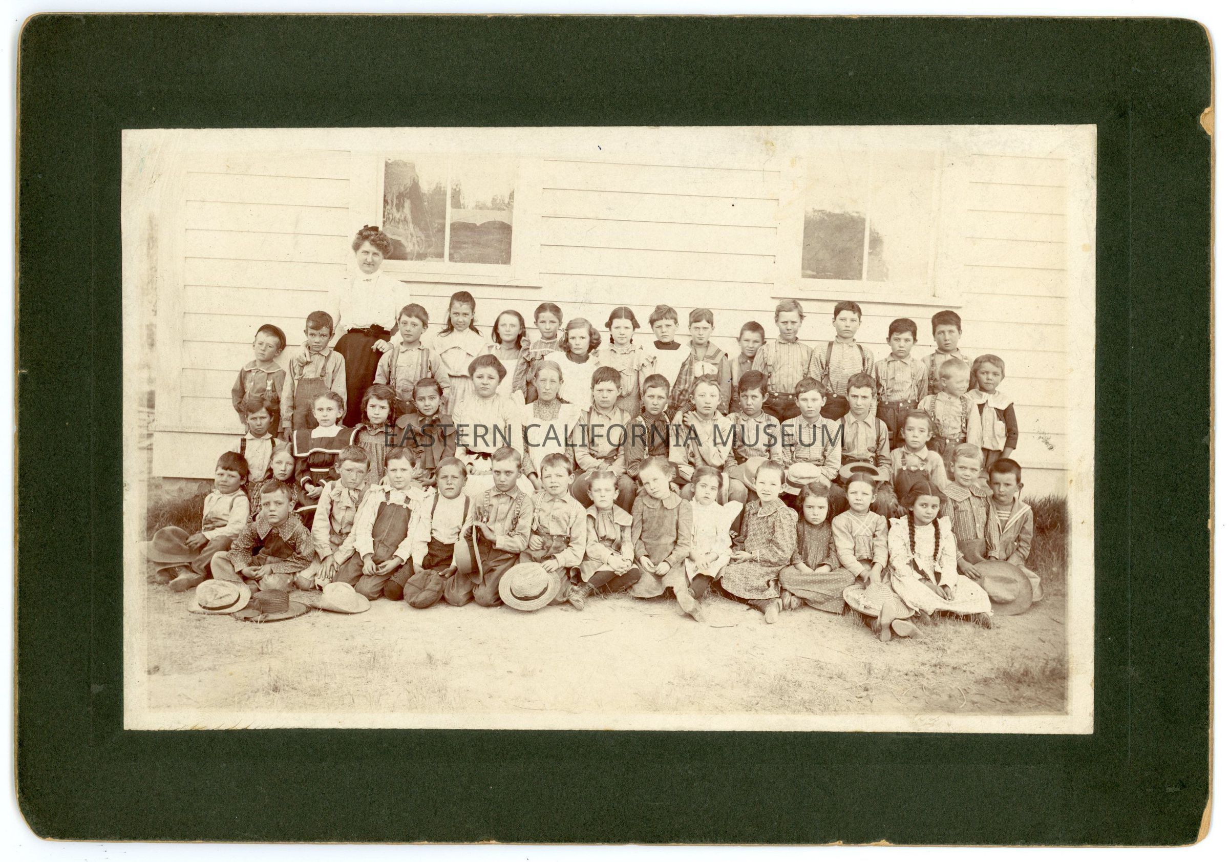 Mounted school photo of a large group of students (about 47) with a female teacher.Collection