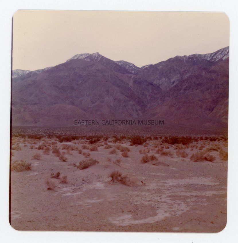 Color photo of the desert landscape and mountains, possibly in Saline Valley.