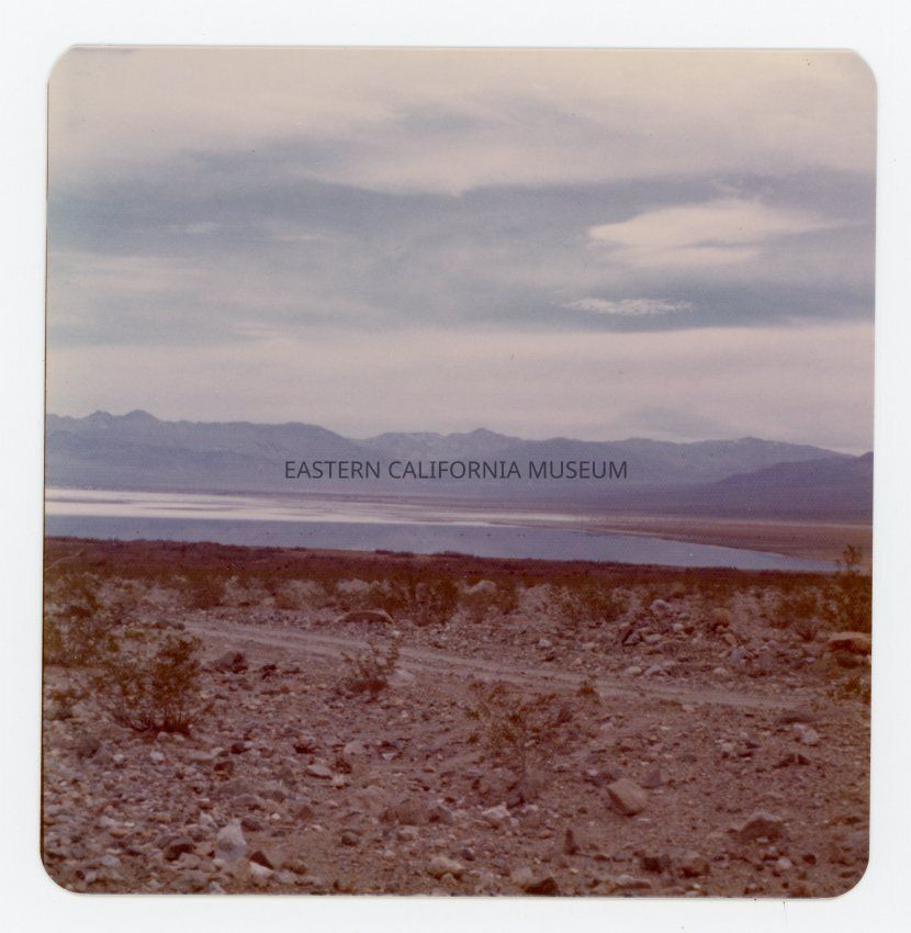 Color photo of the desert landscape and mountains, possibly in Saline Valley. There is a lake in the middle, but no identification.
