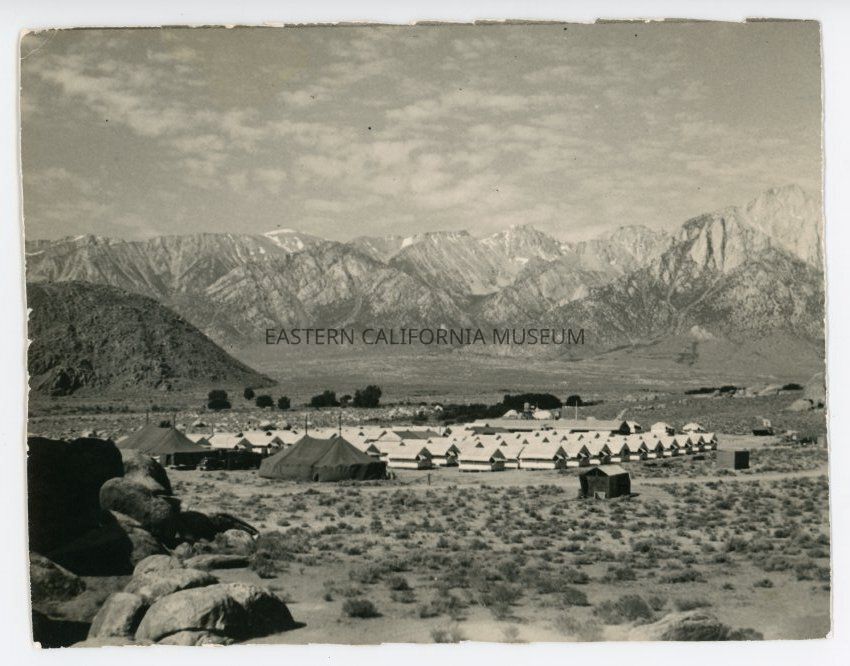 Photo of a large group of tent cabins (for employees working on the movie Gunga Din?) near the Alabama Hills. The Sierra Nevada mountain range in the background.