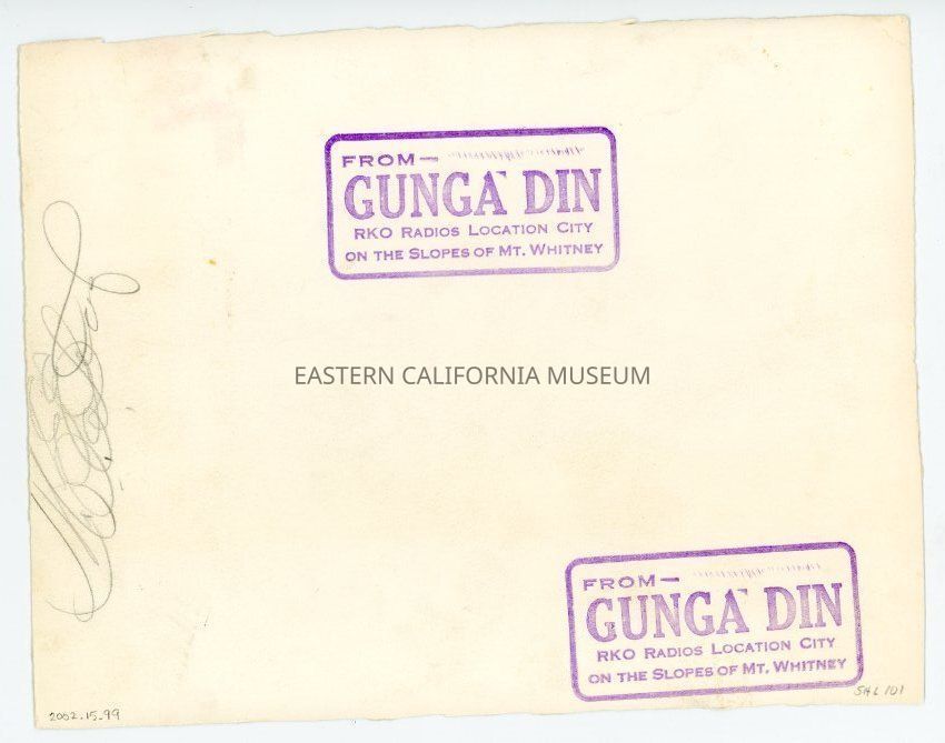 Stamped twice on reverse in purple ink: From Gunga Din RKO Radios Location City on the Slopes of Mt. Whitney.