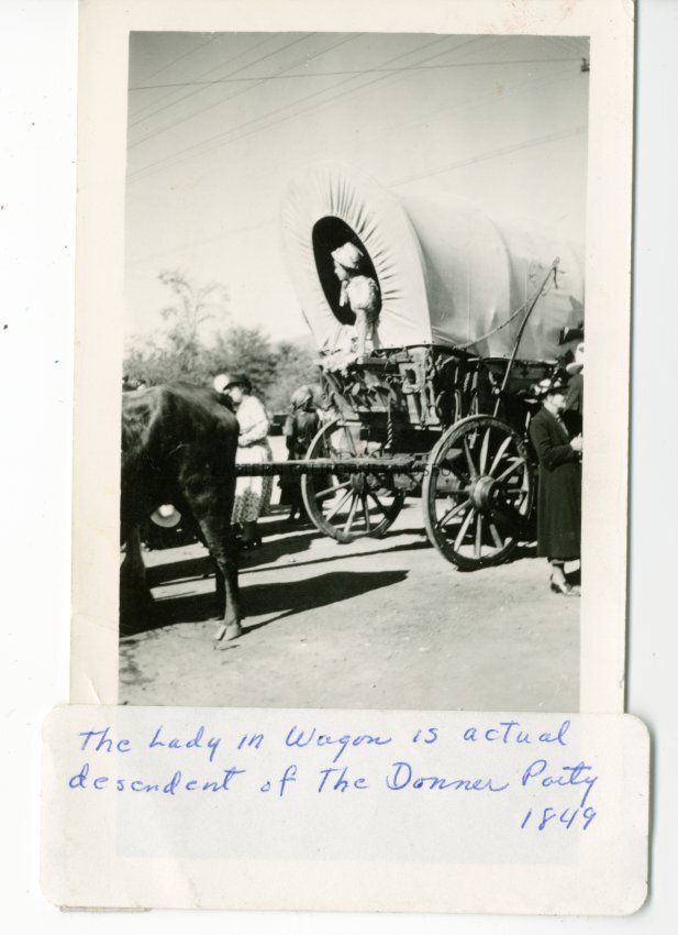 Reverse: Handwritten in black ink: Covered wagon that took part in carrying gourd of water. This wagon is one of the original ones used in crossing the desert in 1849 and girl in wagon is actual descendent of the Donner Party.