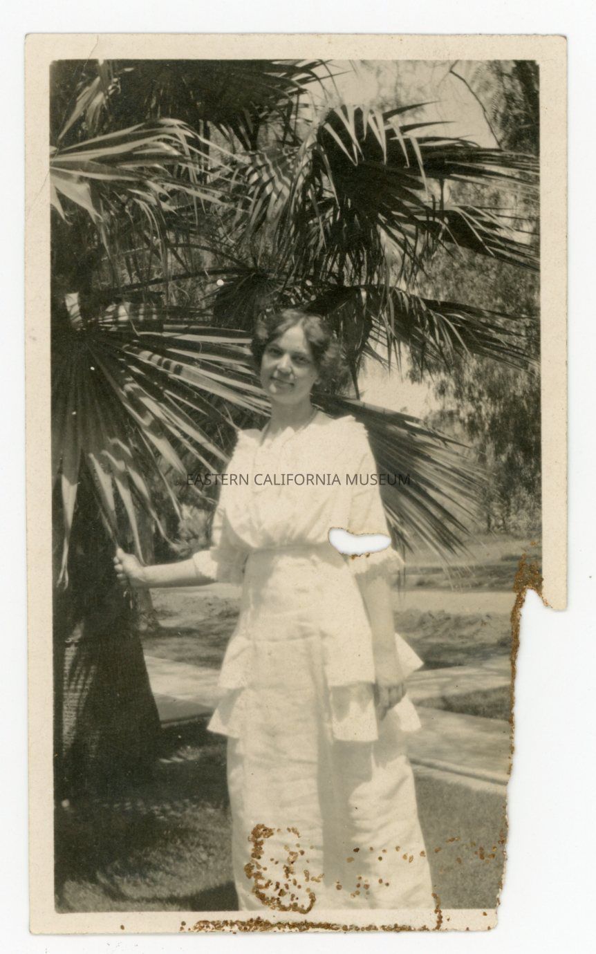 Damaged photo of a young woman in a white dress standing next to a palm tree.