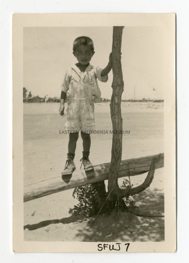 Exterior photograph of an unidentified young boy standing on a log holding onto a slim locust tree. In the distant background are some barracks buildings.Photograph Details