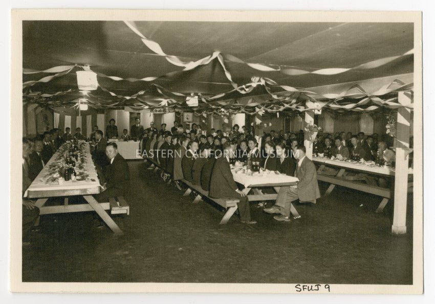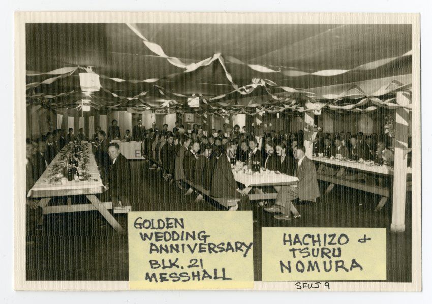 Interior photograph of about 75 people sitting on both sides of 4 long tables with a head table in the background that is perpendicular to the other tables. There are streamers decorating the ceiling, and a banner written in Japanese hanging above the head table. Two yellow post-it labels along the bottom edge of the photo say: "Golden Wedding Anniversary, Blk. 21 Messhall" and "Hachizo + Tsuru Nomura." It appears to be inside one of the Manzanar Mess Halls.