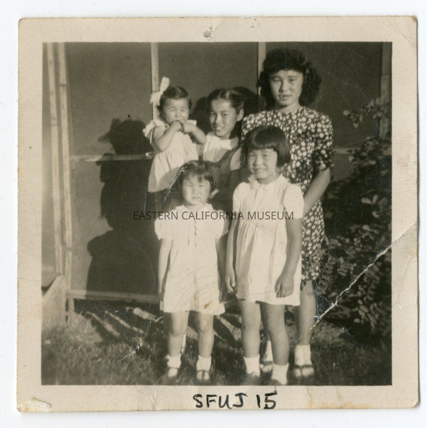 A small photo of a five girls (sisters?) standing in front of a barrack.Photograph Details
