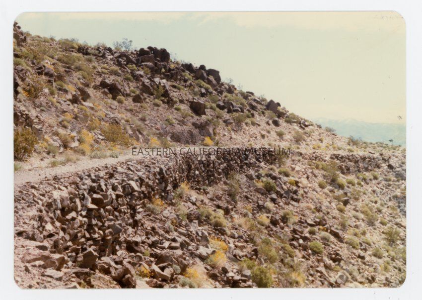 Information from accession paperwork: Collection of photos of the old stage and freight road and retaining wall in Stone Canyon in the Argus Range that led into the Panamint Valley. Photo taken near the Modoc (Calero Puro) Mine. Chinese laborers built the retaining wall circa 1875.Collection