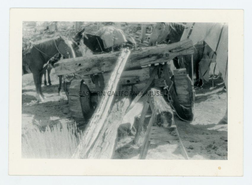 Photo of what looks like a wagon at the Cottonwood Sawmill in 1940 before the mill burned. Several horses/mules in photo. Photo taken by Dr. George Shultz.Collection