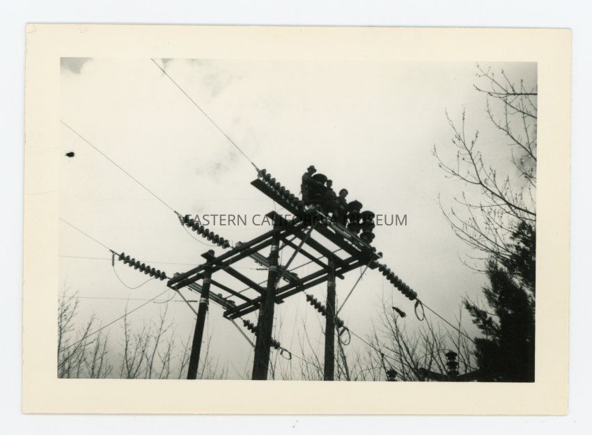Written in pencil on reverse: Haiwee, 03/08/1943. Moore Chewings and "Mose" installing stacks for 110kv sectionalizing switch ready to install switching mechanism on the 1st of 3 sections that make up the south switch tieing to the east line of the Calif. Elect. Co. [California Electric Company] Harry Larson.Collection