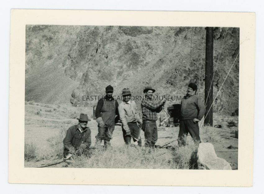 Written in pencil on reverse: Haiwee, 01/29/1943. Left to right: Chas. [Charles] Southey, Verne Chewings, Cruiz Sainz, "Mose" Ruiz, LeRoy Scott. Moore on pole.Collection
