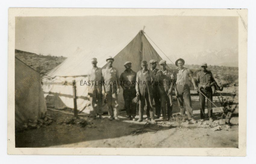 Photo of a group of eight men standing in front of a canvas tent in the desert. The Sierra Nevada mountain range is faintly visible in the background. They are likely LADWP employees constructing power lines.Collection