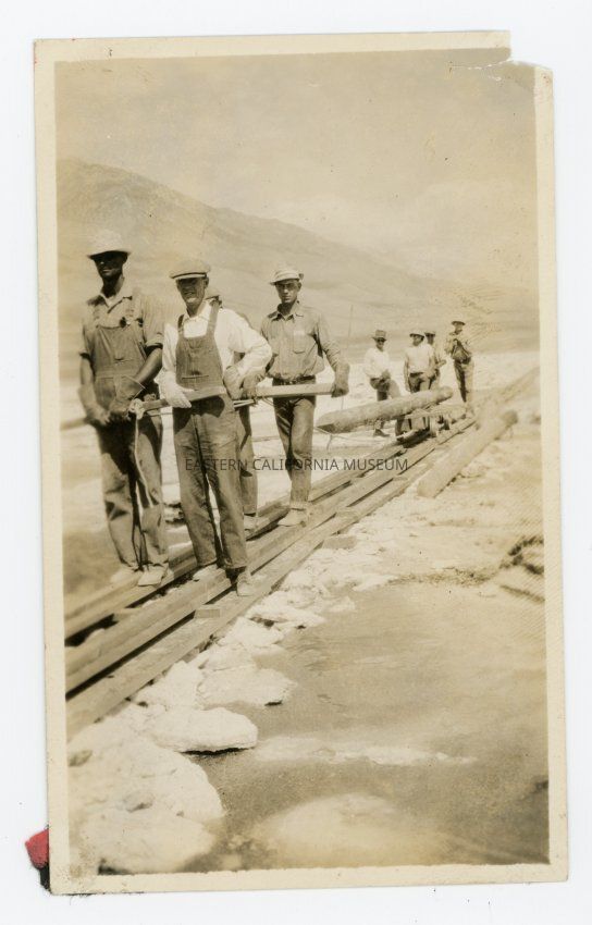 Photo of a group of men walking on wooden boards across the unstable surface of the dry lakebed of the Owens Lake. It looks like they are using a wheeled cart to transport a power pole. They are likely LADWP employees constructing power lines.Collection