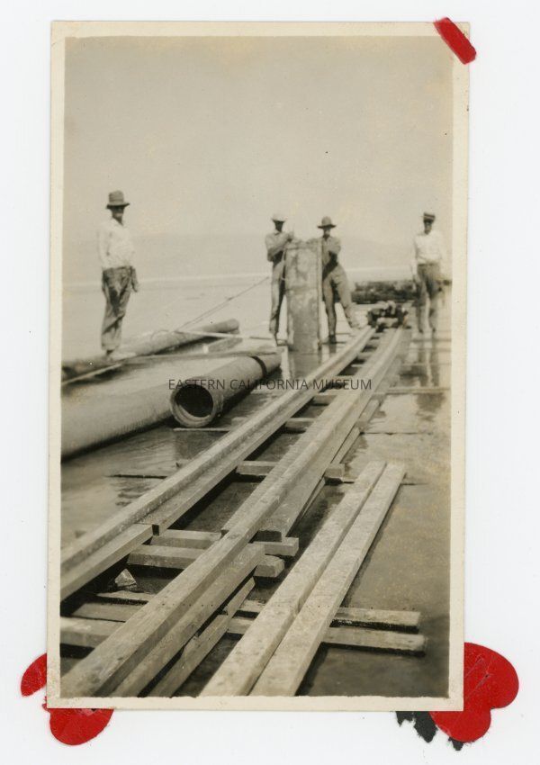 Photo of a group of men working on the (mostly) dry lakebed of the Owens Lake. There is a raised wooden walkway and what looks like a pipe in the photo. They are likely LADWP employees constructing power lines.Collection