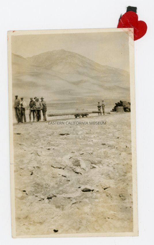 Photo of a group of men working on the (mostly) dry lakebed of the Owens Lake. They are hauling a pole along a raised wooden track, and there is a pile of pipes or poles in the background. They are likely LADWP employees constructing power lines.Collection
