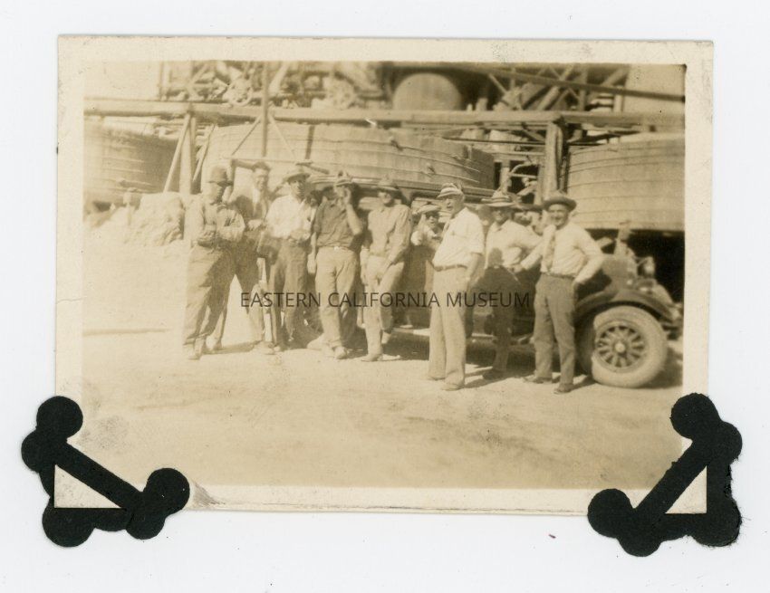 Photo of a group of nine men posing in front of a vehicle which is parked in front of some sort of plant, factory, refinery, or very large machinery. Photo is similiar to 1992.41.60.Collection