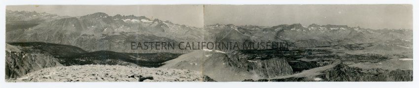 Written in old black ink on reverse: Looking west from summit of Mt. Whitney showing Kern River Canyon, Kaweah Peaks, and Table Mountain. Foto [photo] by M. A. Williamson, M.D.