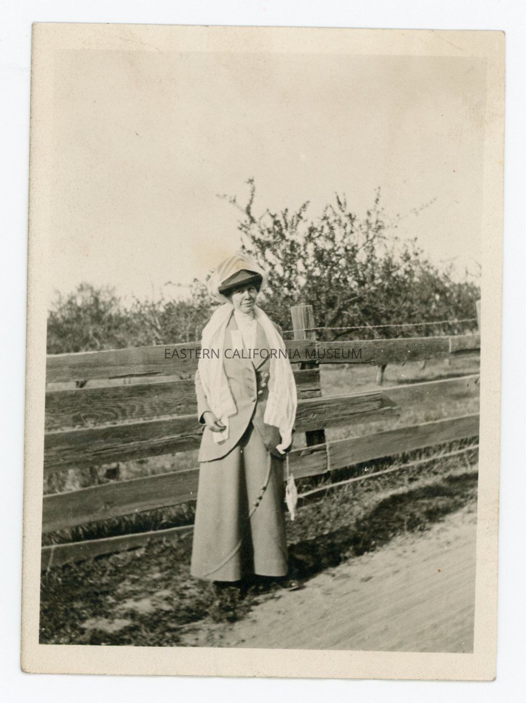 Photo of a woman standing in front of a wooden fence with what looks like an orchard in the background. She may possibly be wearing a driving outfit.Collection
