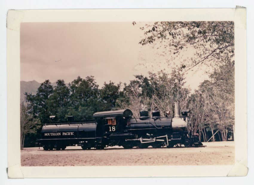 Color photo of Southern Pacific engine #18 and tender, likely at Dehy Park in Independence.