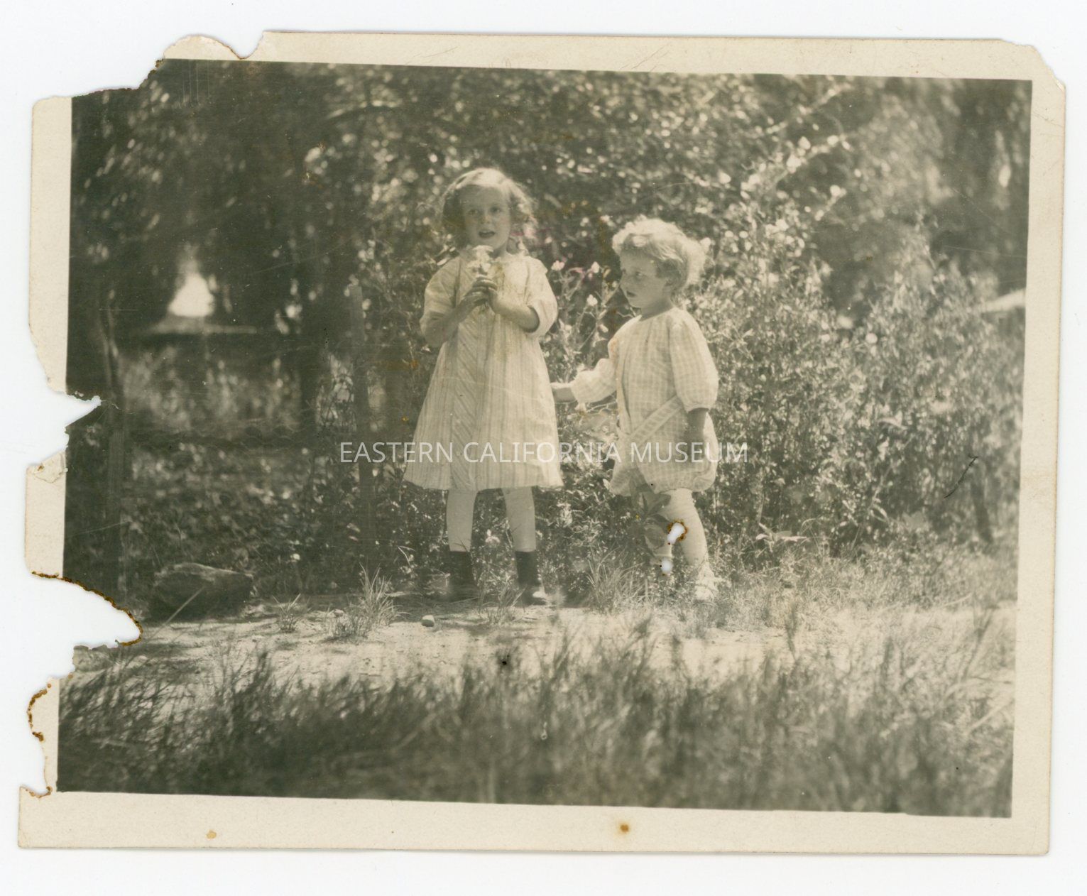 Damaged photo of two young children, both dressed in white, outside. The little girl on the left is holding a bouquet of flowers in her hands.Collection