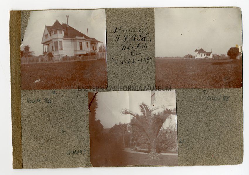 A1831.1.6a: Exterior photo of a two story house identified as the home of T. F. Butler in Palo Alton on November 26, 1899.